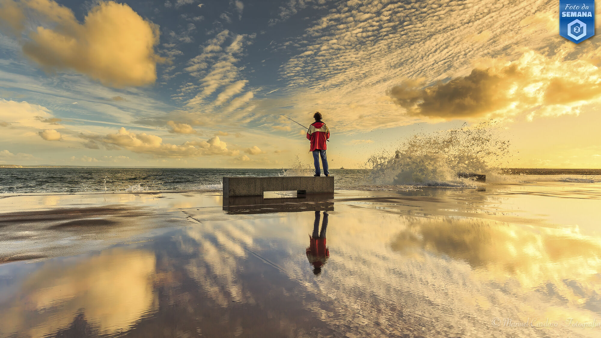 O grande vencedor foi Manuel Cardoso com uma fotografia de paisagem de um pescador que parece estabelecer uma relação íntima com a vastidão que o rodeia. De costas para o observador, o pescador torna-se um mediador entre dois mundos: o céu dourado, carregado de luz e textura, e os reflexos no chão que duplicam essa mesma realidade. A imagem constrói-se assim como um jogo de espelhos, onde o real e o refletido se confundem. O instante da onda a rebentar introduz movimento e tensão, contrastando com a quietude da postura humana e do resto da paisagem. A luz dourada envolve a cena numa atmosfera onírica, elevando o momento para um outro nível. É uma contemplação do infinito — um encontro entre o indivíduo e a imensidão, onde o silêncio fala mais alto do que qualquer ação. A fotografia do Manuel conquistou 48 estrelas. Parabéns, Manuel!