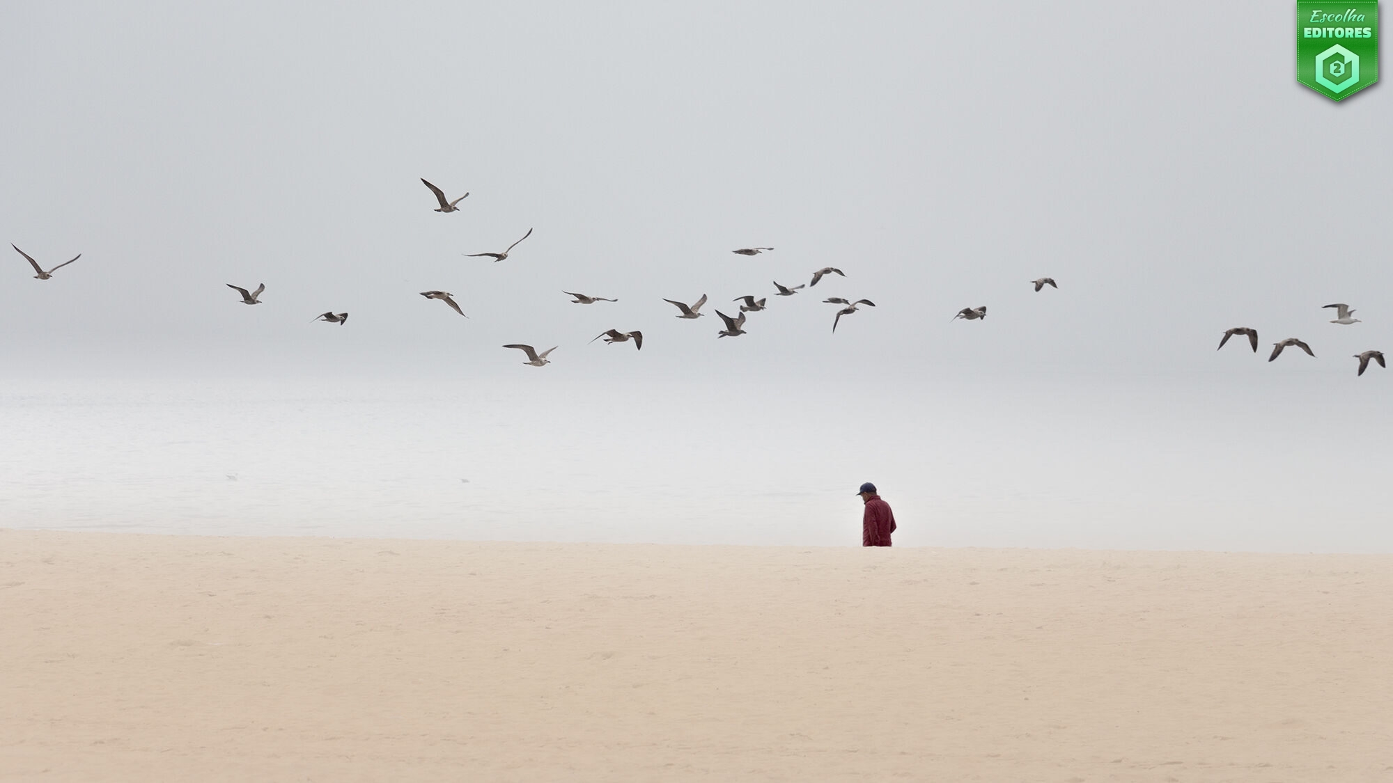 Em terceiro lugar temos Sandra Gomes com uma fotografia que funde a vastidão quase monocromática do céu e do mar, de onde uma figura humana surge como um pensamento tardio, pequeno e silencioso. A figura humana caminha ao longo da areia como se atravessasse uma página em branco, enquanto que no céu as aves desenham um contraponto orgânico — um traço vivo numa composição dominada pelo vazio. Não há horizonte definido, apenas uma transição subtil entre tons, criando a sensação de que o espaço se estende infinitamente para além do enquadramento. Uma fotografia com uma estética minimalista rigorosa, sustentada por uma palete de cores extremamente contida e por uma luz difusa. A composição é horizontal e equilibrada: a linha da areia ancora o enquadramento no terço inferior, enquanto que o bando de aves ocupa o terço superior, criando tensão visual entre peso e leveza. É uma imagem que transforma o espaço negativo em protagonista e faz do silêncio uma matéria visível. A fotografia da Sandra recebeu 59 estrelas. Parabéns, Sandra!