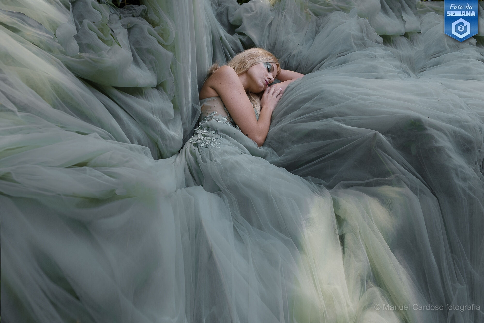 O grande vencedor foi Manuel Cardoso com uma fotografia de uma modelo que repousa envolta num vestido que se expande como se fosse um mar repleto de ondas, enquanto que o rosto, sereno, de olhos fechados, parece abandonado, num sonho ou até mesmo num momento de suspensão no tempo. A modelo não ocupa o espaço — funde-se com ele, tornando-se parte de uma composição onde forma e emoção são indissociáveis. A palete cromática é fria e contida, dominada por tons pastel, reforçando a atmosfera onírica. A composição é fluida com as linhas do tule a conduzirem o olhar em espiral até ao rosto da modelo, que funciona como núcleo emocional da imagem. É uma fotografia que se aproxima da pintura e do sonho, onde a técnica serve a delicadeza do gesto e a quietude da narrativa. A fotografia do Manuel conquistou 80 estrelas. Parabéns, Manuel!