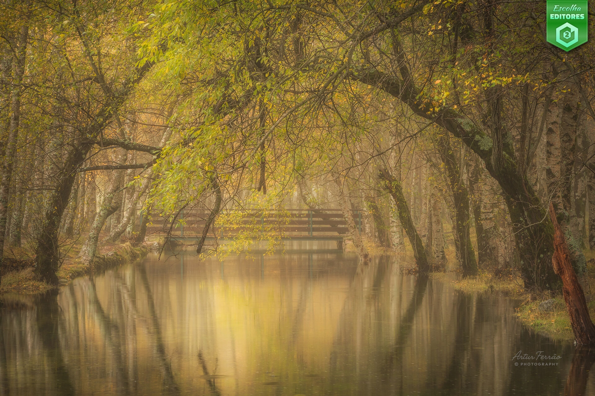 O segundo lugar pertence a Artur Ferrão com uma fotografia de um bosque que emerge envolto em névoa, como se a floresta respirasse lentamente a luz morna do outono. As árvores inclinam-se sobre a água com uma delicadeza quase coreográfica, num convite discreto para atravessar do mundo físico para o território da contemplação. O reflexo duplica a cena, dissolvendo a fronteira entre a realidade e a imaginação, enquanto que as folhas amarelas parecem flutuar num estado de permanente suspensão. É uma fotografia de bosque que não se limita a documentar o lugar, mas sim a documentar um estado de espírito. A imagem do Artur conquistou 64 estrelas. Parabéns, Artur!
