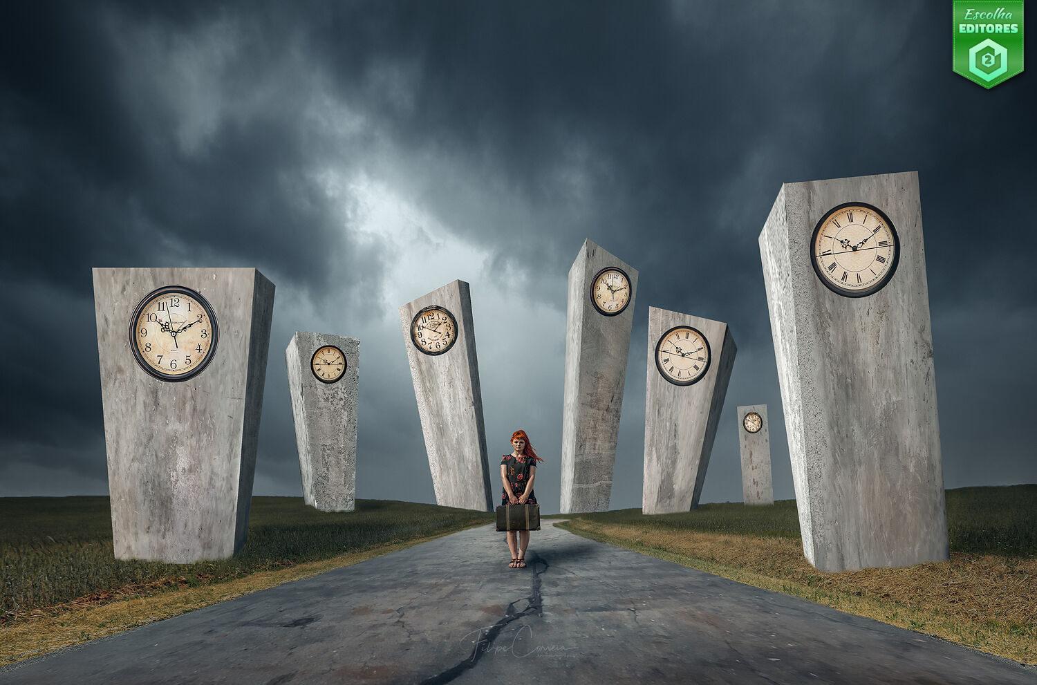 Em segundo lugar ficou Filipe Correia com uma fotografia surrealista que explora a ideia de tempo e do seu colapso. Uma mulher de vestido escuro segura uma mala, estática diante do absurdo, como se estivesse numa espera eterna, num momento de escolha paralisado pelo peso do tempo. Cada relógio marca uma hora diferente: talvez memórias ou talvez versões de um destino que nunca se irá concretizar. Uma partida ou uma chegada? Ninguém sabe, a incerteza reina e domina toda a cena. A imagem do Filipe conquistou 53 estrelas. Parabéns, Filipe!