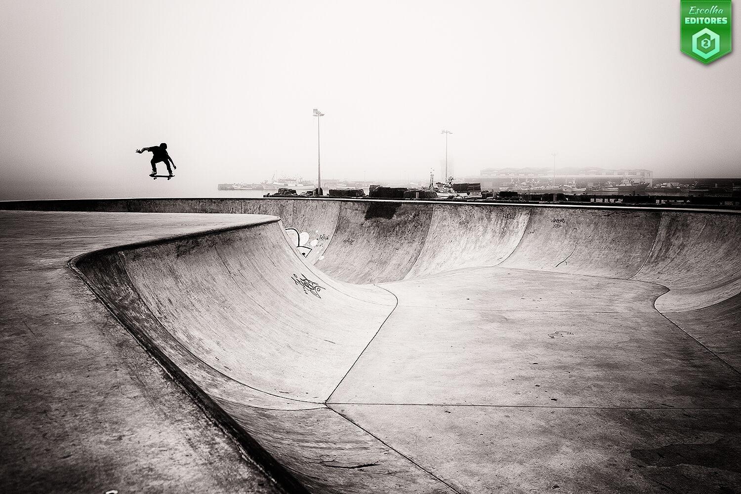 O segundo lugar pertence também a Bruno Castro Progmet com uma criativa fotografia capturada num skatepark onde se destaca um skater suspenso no ar. A amplitude do enquadramento reforça a solidão do movimento, enquanto que o horizonte enevoado dissolve os limites do espaço. O contraste permite ler as texturas do betão e o recorte nítido da silhueta de forma perfeita. É um estudo sobre o equilíbrio: o peso, a leveza e a breve eternidade do instante. A imagem do Bruno conquistou 60 estrelas. Parabéns, Bruno!