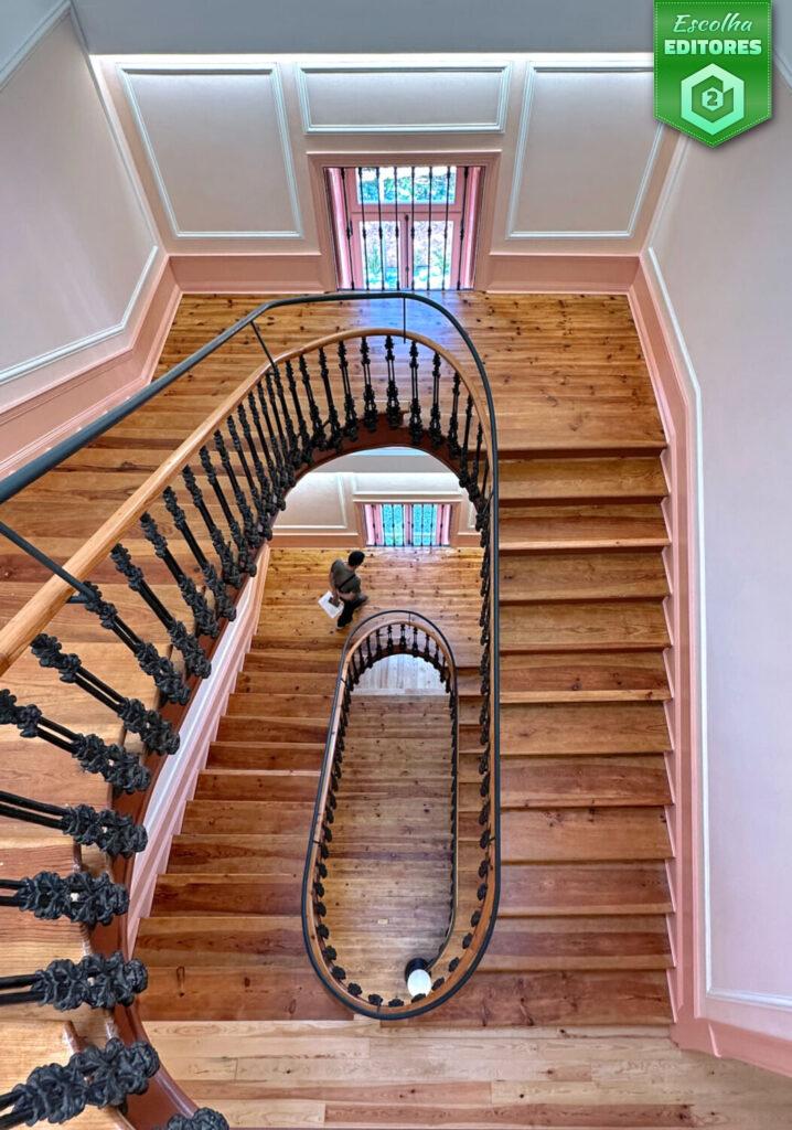 Também em terceiro lugar ex-aequo temos Luis Lobo Henriques, com uma fotografia de arquitetura que se auxilia de uma perspetiva elevada para fazer com que uma escadaria se transforme numa autêntica espiral de madeira e ferro, num autêntico coração arquitetónico que pulsa entre andares. A geometria domina a composição, mas é a figura humana, estrategicamente posicionada, que introduz o ritmo e a escala. A luz natural, que atravessa as janelas, desenha nuances quentes sobre o tom ambarino do soalho, reforçando a textura viva da madeira. O ferro forjado, com o seu desenho repetitivo, cria uma cadência visual que guia o olhar para o centro, num movimento hipnotizante. A fotografia alia precisão técnica com o ângulo de fuga bem calculado e uma sensibilidade estética, transformando assim a arquitetura em poesia. A fotografia do Luis recebeu também 42 estrelas. Parabéns, Luis!