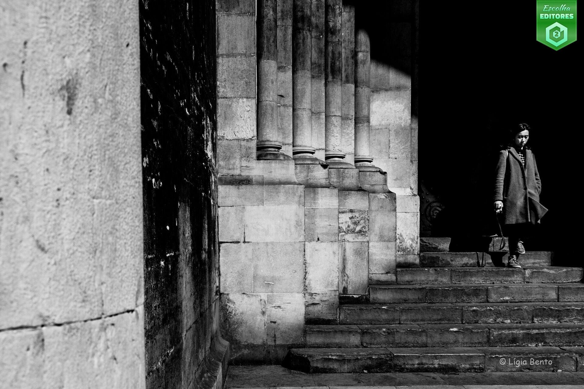 Em terceiro lugar temos Lígia Bento com uma fotografia de rua onde, entre a luz e a escuridão, uma figura feminina desce umas escadas como quem atravessasse o tempo. O enquadramento rigoroso valoriza a verticalidade das colunas e a textura austera da pedra, enquanto que o preto e branco acentua o drama do contraste. A luz recorta o rosto e o casaco, transformando o quotidiano num instante cinematográfico. A exposição preserva perfeitamente os detalhes das zonas iluminadas e faz com que o resto da cena mergulhe num denso mistério. Há nesta imagem uma atmosfera de solidão urbana e introspeção, em que o espaço monumental parece amplificar o silêncio interior da personagem. É fotografia como narrativa — um fragmento de história contido num momento de luz. A fotografia da Lígia recebeu 42 estrelas. Parabéns, Lígia!
