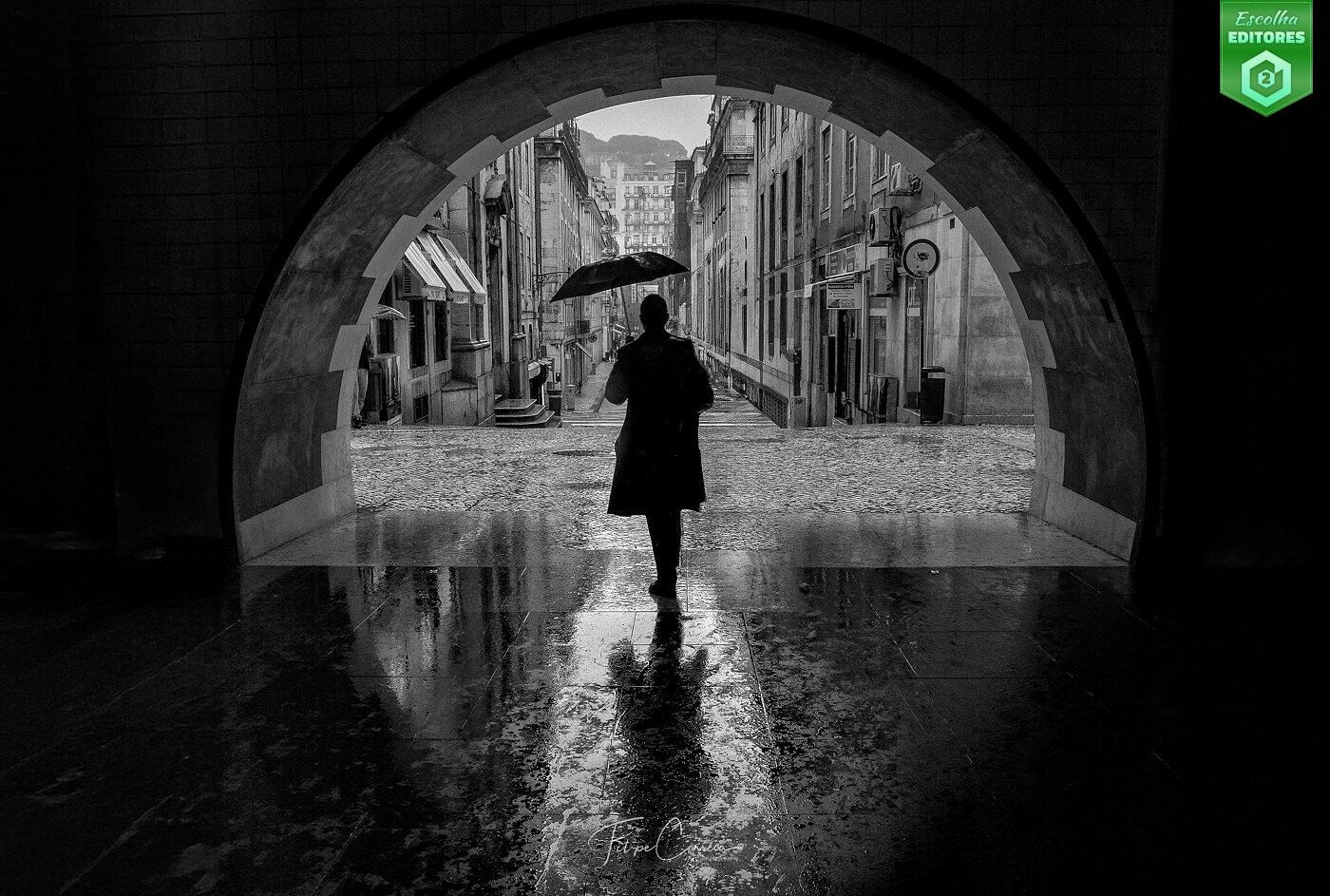 Em terceiro lugar temos Filipe Correia, com um fotografia onde o mundo parece suspenso entre o som da chuva e o eco dos passos de uma figura solitária que rompe a cena. A cidade, vista através do arco, ganha contornos de um cenário cinematográfico — melancólica, mas ao mesmo tempo acolhedora, como se houvesse algo de eternidade neste caminhar solitário e no brilho frio do chão encharcado. A imagem explora magistralmente o contraste e o uso de linhas arquitetónicas, com a simetria do arco a emoldurar a composição como um olho que observa a cidade respirar sob a chuva. A silhueta central cria um ponto de tensão visual, equilibrado pela textura da rua refletida e a profundidade é ampliada pelo alinhamento urbano. O preto e branco valoriza os tons de cinza que a chuva oferece, e a ausência de cor transforma a cena num poema visual de introspeção. A fotografia do Filipe recebeu 36 estrelas. Parabéns, Filipe!