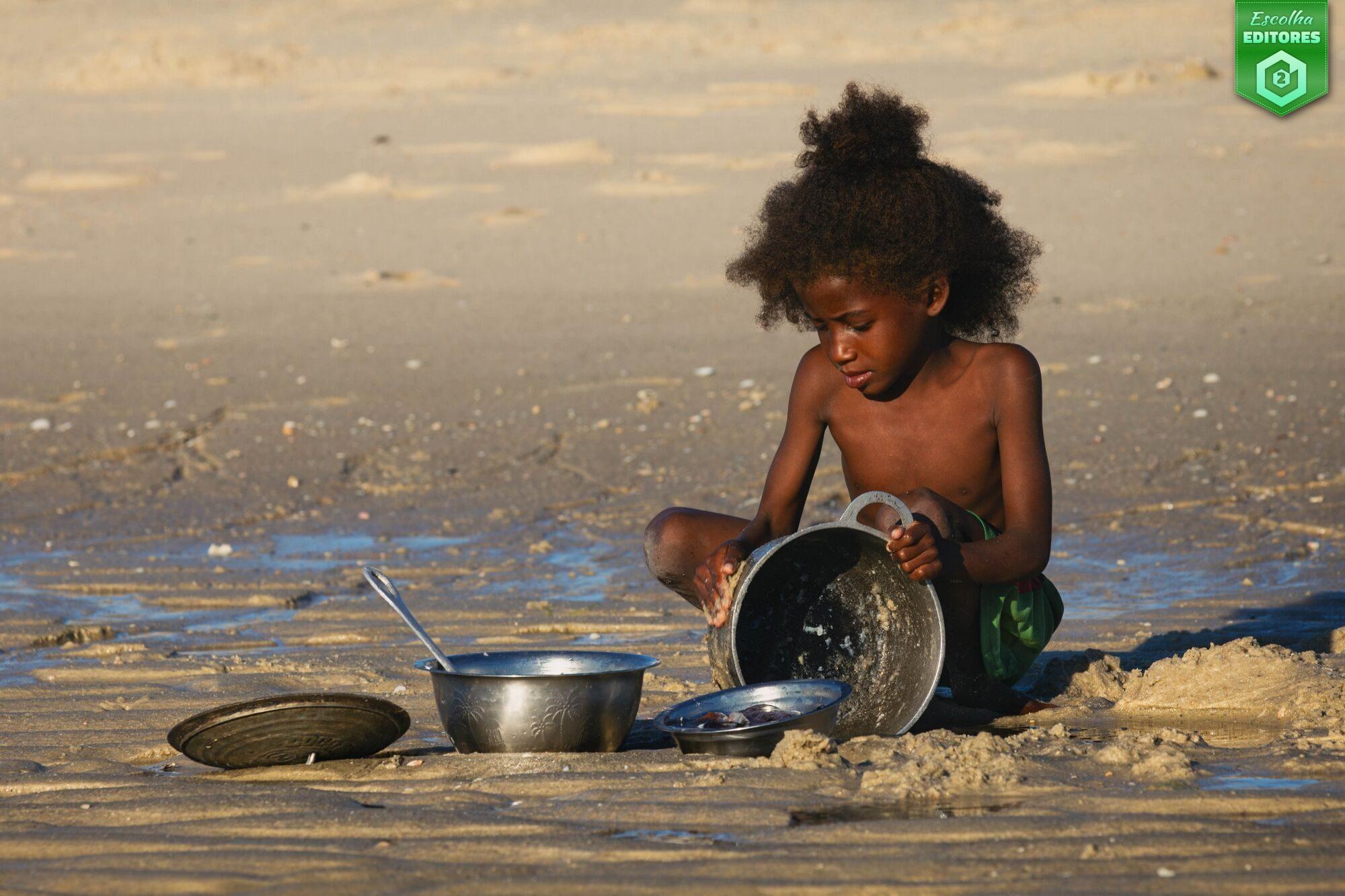 Em segundo lugar ficou António Carreira com uma fotografia que captura um momento muito interessante: no areal aquecido pelo sol, uma criança limpa uma série de panelas de metal. Com certeza um momento banal na vida desta criança, mas aqui retratado nesta fotografia é como se fosse uma espécie de rito íntimo, como se as panelas fossem instrumentos sagrados manuseados com a solenidade de quem reconhece o valor de cada recurso. É uma cena de simplicidade crua, onde brincar e sobreviver talvez caminhem lado a lado. O enquadramento baixo coloca o observador ao nível da criança, promovendo empatia e proximidade emocional. É sem dúvida uma narrativa visual que toca pela beleza invisível do quotidiano. A imagem do António conquistou 48 estrelas. Parabéns, António!