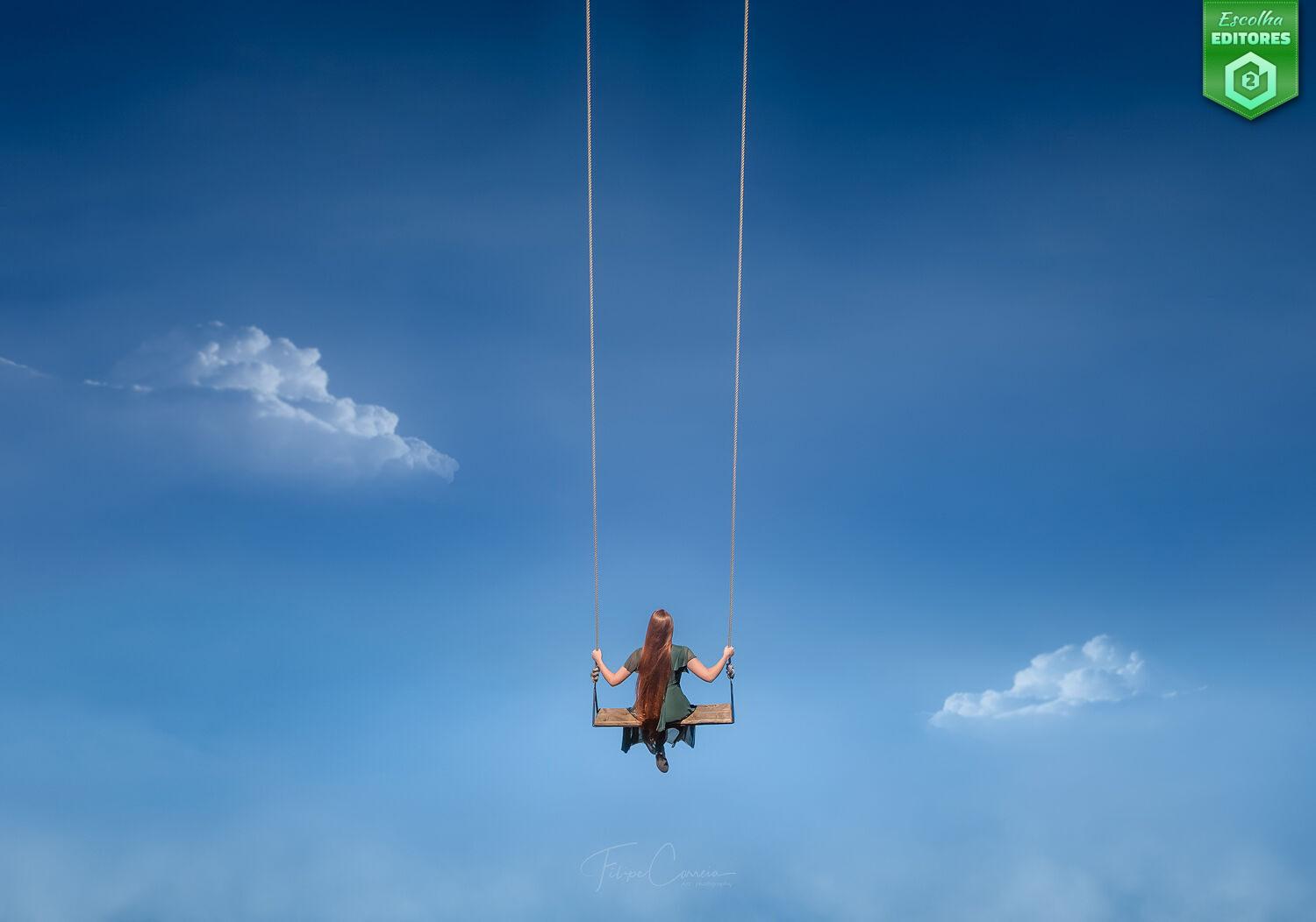 Em segundo lugar ficou Filipe Correia com uma fotografia minimalista onde uma figura feminina de longos cabelos sentada num baloiço se lança em direção ao grande vazio azul do céu. O surrealismo está presente, a fotografia é um convite ao sonho e à liberdade absoluta. O baloiço é um símbolo de leveza e de evasão — um gesto de ascender acima das preocupações terrenas e entrar num espaço de pura imaginação. A solidão da figura reforça a introspeção: o voo é pessoal, íntimo, quase espiritual. A imagem do Filipe conquistou também 47 estrelas. Parabéns, Filipe!