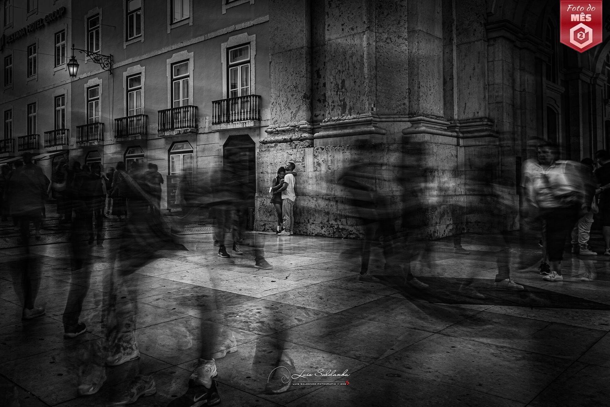 O grande vencedor foi Luis Saldanha com uma fotografia de rua capturada numa esquina onde tudo parece estar de passagem e, em contraponto, duas figuras abraçadas tentam deter o tempo. O casal, imóvel junto à parede, é o centro de uma coreografia fantasmagórica de figuras em movimento. A longa exposição dissolve a multidão em vultos, transformando o ruído da cidade num murmúrio visual. O preto e branco intensifica o contraste entre a permanência e a efemeridade, criando um diálogo entre a estática das paredes e a fluidez da multidão. A luz suave que toca os rostos do casal reforça a ternura do momento, isolando-os do caos em redor. Com uma técnica muito refinada, a fotografia conjuga precisão de enquadramento, domínio da exposição e sentido poético — é a fotografia como metáfora do amor na azáfama dos tempos modernos. A fotografia do Luis conquistou 57 estrelas. Parabéns, Luis!
