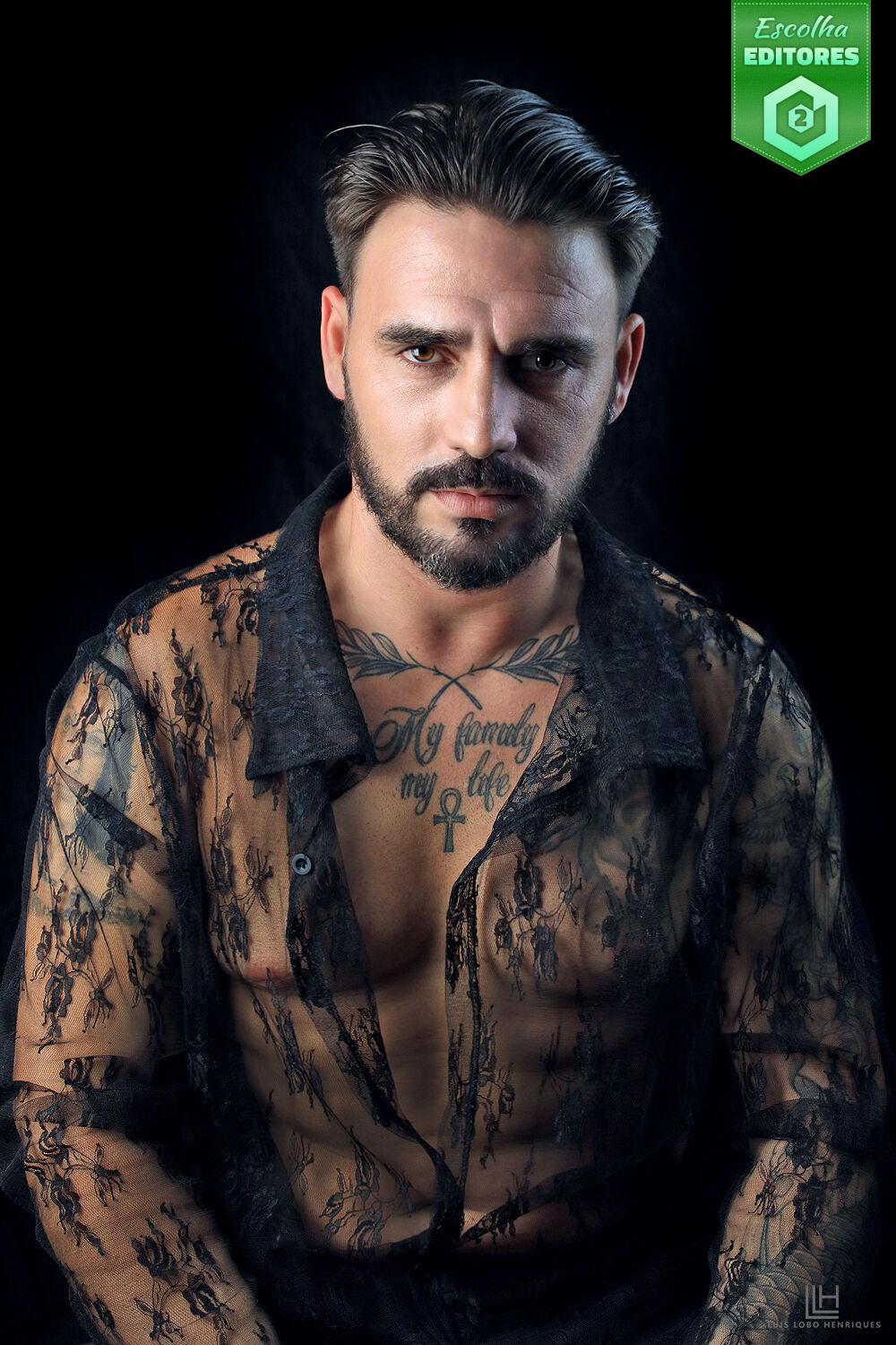 Em terceiro lugar temos Luis Lobo Henriques com um retrato onde o olhar firme e a postura frontal do modelo revelam um equilíbrio tenso entre vulnerabilidade e poder. A camisa translúcida, rendada, transforma a pele em paisagem e o corpo em linguagem. O fundo negro isola o sujeito num espaço quase teatral, onde cada detalhe, do brilho dos olhos à textura do tecido da camisa, é esculpido na perfeição pela iluminação lateral. A fotografia joga com contrastes — não só o contraste entre a escuridão e a luz, mas também entre a dureza do olhar e a delicadeza da camisa. Tecnicamente impecável, é uma composição que transcende o retrato para se tornar afirmação de presença e emoção. A fotografia da Luis recebeu 36 estrelas. Parabéns, Luis!