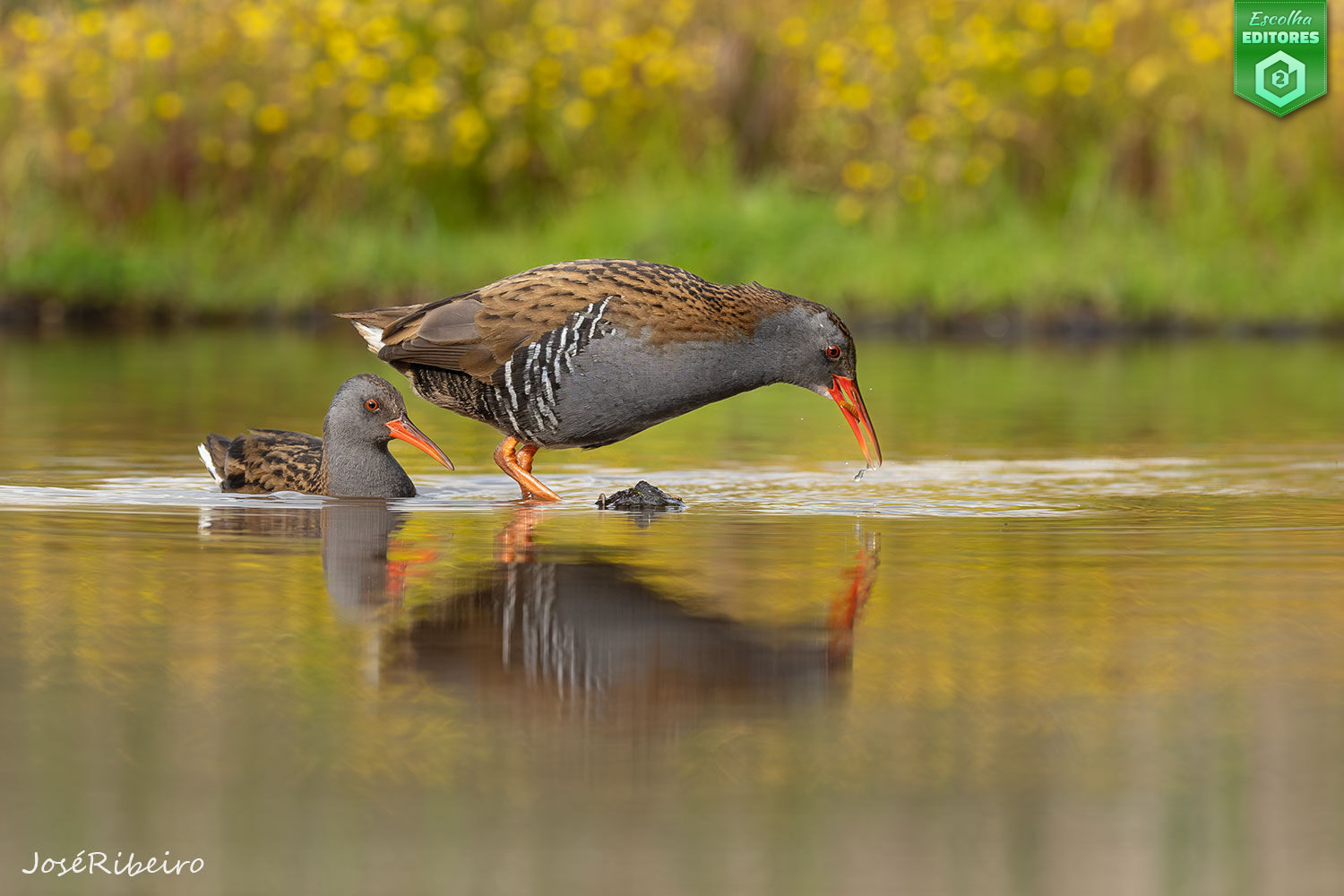 Em terceiro lugar temos José Ribeiro com uma fotografia de vida selvagem de dois frangos-de-água que parecem estar numa coreografia silenciosa entre caça e companheirismo. Um deles mergulha o bico na água em busca de alimento; enquanto que o outro acompanha-o, quase como uma sombra. O reflexo, suave e ligeiramente difuso, prolonga a cena, criando uma duplicação que reforça a sensação de equilíbrio e serenidade. O uso de uma perspetiva baixa, basicamente ao nível da água, aproxima o observador da ação e valoriza o reflexo. A nitidez nas aves contrasta com a fluidez da água, enquanto que o momento captado acrescenta narrativa à composição. A fotografia do José conquistou 32 estrelas. Parabéns, José!