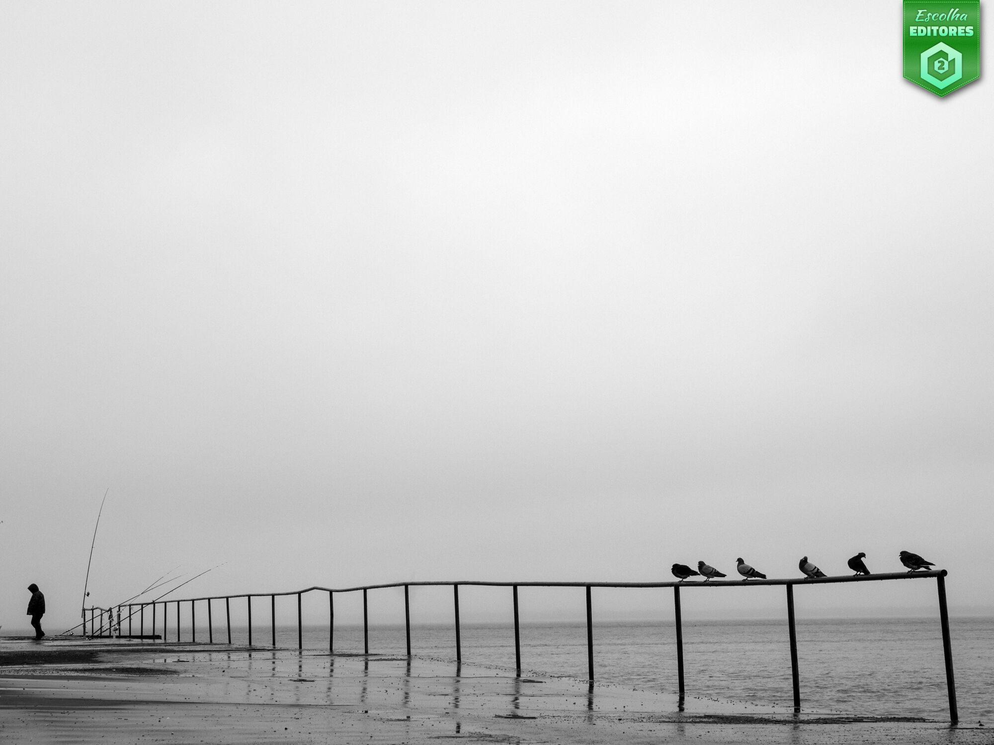 O segundo lugar pertence a Carlos Gaspar Reis com uma fotografia minimalista onde o vazio se torna linguagem. À esquerda, um pescador, diminuto como uma nota isolada numa pauta silenciosa. À direita, as pombas pousadas transformam a banalidade do corrimão em algo especial e impõem ritmo à cena. O preto e branco intensifica a estética minimalista, destacando formas e silhuetas. A composição obedece a uma lógica horizontal clara: uma linha que cruza o enquadramento e divide o espaço entre presença e vazio. É uma fotografia que respira silêncio, um poema sobre solidão e equilíbrio. A imagem do Carlos conquistou 46 estrelas. Parabéns, Carlos!