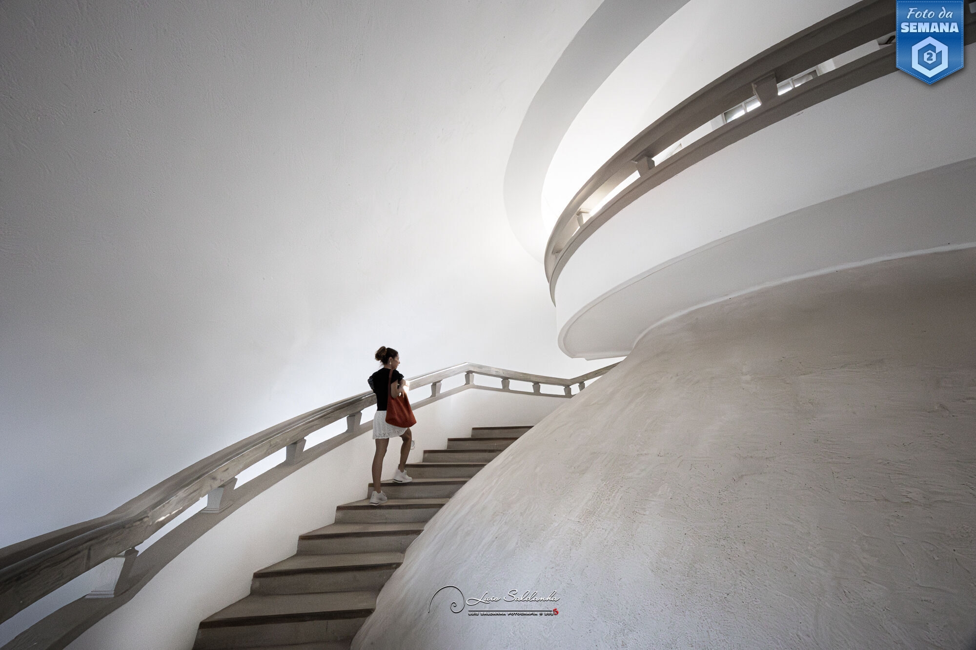 O grande vencedor foi Luis Saldanha com uma delicada fotografia de arquitetura que se caracteriza pela ausência de sombras pesadas e onde os gradientes de luminosidade dominam. Uma figura humana, pequena perante a enormidade da forma arquitetónica, introduz escala e narrativa: ela é o ponto quente num espaço dominado por superfícies frias, o movimento dentro de um cenário completamente estático. O ponto de vista amplo expande o espaço, acentuando as curvas e a sensação de ascensão contínua, cabendo à composição usar as linhas ascendentes para guiar o olhar até ao topo, enquanto que a figura humana, isolada, funciona como âncora emocional. A desaturação do ambiente realça o branco dominante, criando um ambiente etéreo. É uma fotografia onde arquitetura e humanidade se encontram numa cena simples e poética. A fotografia do Luis conquistou 47 estrelas. Parabéns, Luis!