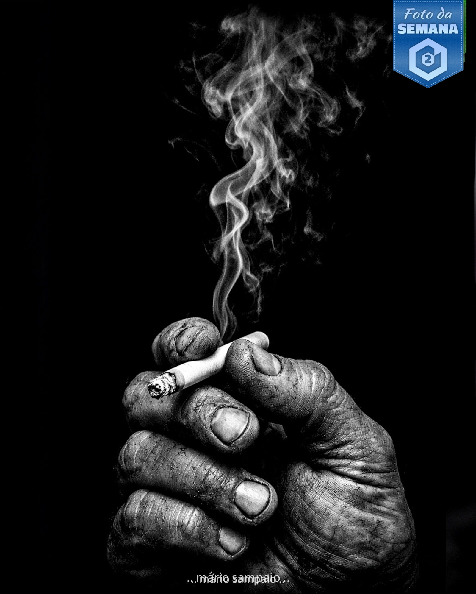 O grande vencedor foi Mário Sampaio com uma fotografia intimista caracterizada por um negro absoluto de onde emerge uma mão que parece esculpida pelo trabalho, pelo tempo e pela repetição dos gestos, como que cada fissura da pele carregasse um pedaço de uma biografia silenciosa. O cigarro, pequeno e frágil entre os dedos calejados, torna-se quase irrelevante face à densidade humana que o envolve. A fumaça sobe lentamente, desenhando curvas efémeras no vazio, como pensamentos que se dissipam antes de serem ditos. Não há rosto, não há contexto — apenas o essencial: matéria, desgaste e respiração. A escolha do preto e branco é decisiva e profundamente consciente. O contraste elevado destaca a textura extrema da pele e os relevos da mão, amplificando cada detalhe. O fundo totalmente negro isola o sujeito de qualquer distração, criando uma leitura quase escultórica. É uma imagem onde a técnica está ao serviço da matéria humana — crua, honesta e sem concessões. A fotografia do Mário conquistou 43 estrelas. Parabéns, Mário!