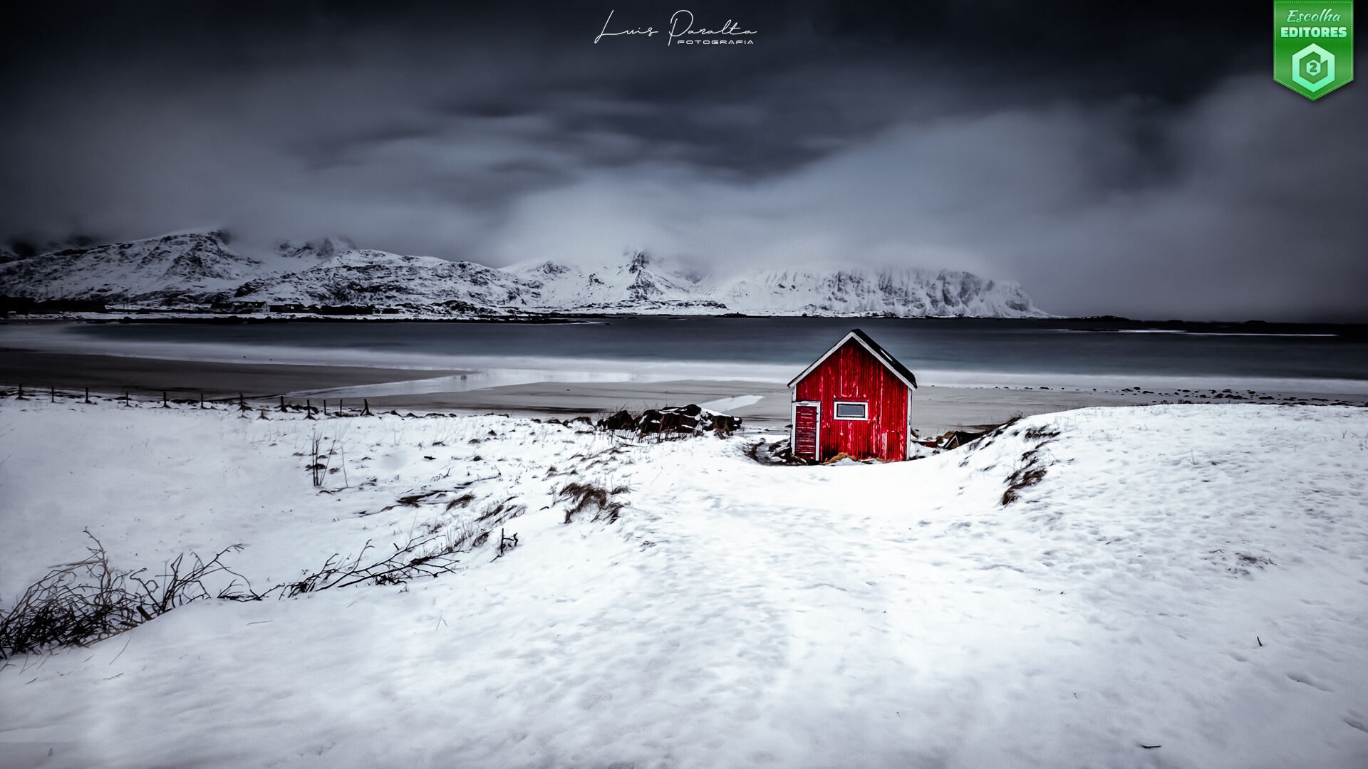 Em segundo lugar temos Luís Paralta com uma fotografia de paisagem onde a neve apaga caminhos e silencia distâncias e uma pequena cabana vermelha se ergue como um ponto de resistência visual e emocional. Isolada num cenário fechado por uma muralha de montanhas, a cabana parece guardar histórias que o vento não ousa contar. O céu pesado, carregado de nuvens baixas, desce quase até ao horizonte, comprimindo a paisagem e reforçando a sensação de recolhimento. Aqui, a cor não é ornamento — é sobrevivência, pois o vermelho pulsa contra o cinzento e o branco como um coração exposto no meio do frio. A imagem é caracterizada por um contraste cromático magistral, onde a saturação controlada da cabana rompe deliberadamente uma palete fria e quase monocromática. A composição aposta numa forte leitura horizontal, com camadas bem definidas, criando profundidade sem recorrer a elementos complexos. É uma fotografia que fala de silêncio, mas com voz firme. A fotografia do Luís também conquistou 43 estrelas. Parabéns, Luís!