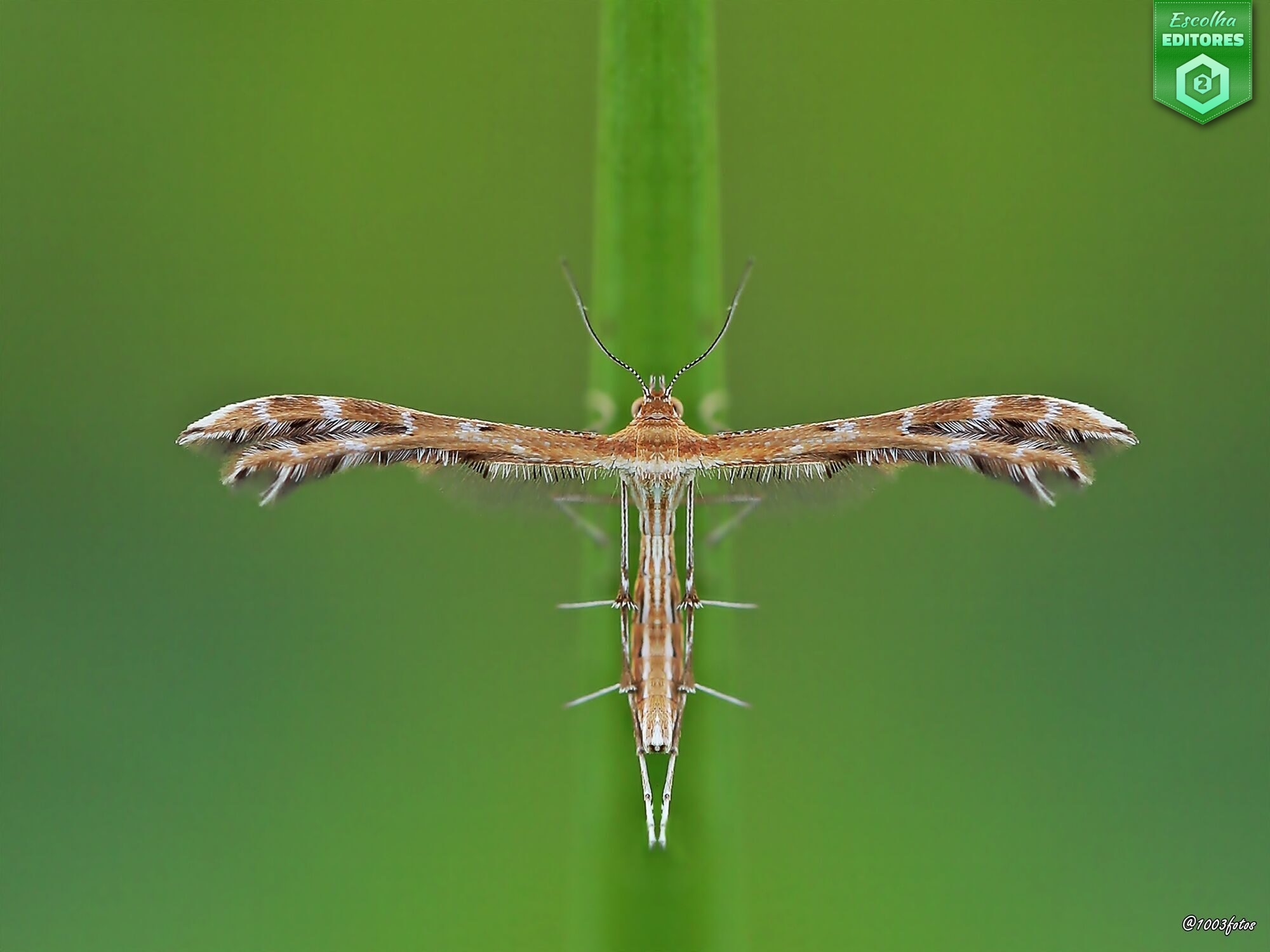 Em terceiro lugar temos José Silva com uma fotografia macro de uma pequena traça que abre as asas como um diagrama perfeito da natureza, onde cada linha, cada filamento e cada padrão se repetem com rigor quase matemático, numa tensão subtil entre o orgânico e o geométrico. A composição centralizada assume a simetria como elemento estrutural, sem receio de quebrar regras clássicas, porque aqui a simetria é o próprio tema. É uma fotografia de precisão, paciência e respeito pelo instante mínimo. A fotografia do José conquistou 32 estrelas. Parabéns, José!