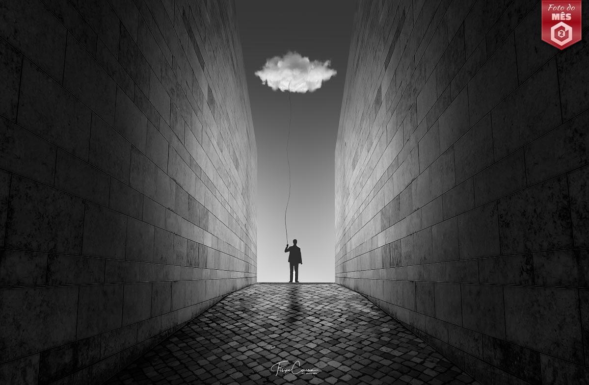 O Filipe presenteou-nos com uma verdadeira obra-prima do surrealismo visual contemporâneo. O uso do preto e branco acentua o contraste entre luz e sombra, conferindo à imagem uma atmosfera simultaneamente poética e enigmática. O enquadramento apoiado nas duas paredes imponentes, canaliza o olhar do espetador diretamente para a figura solitária, criando uma sensação dramática de profundidade.
