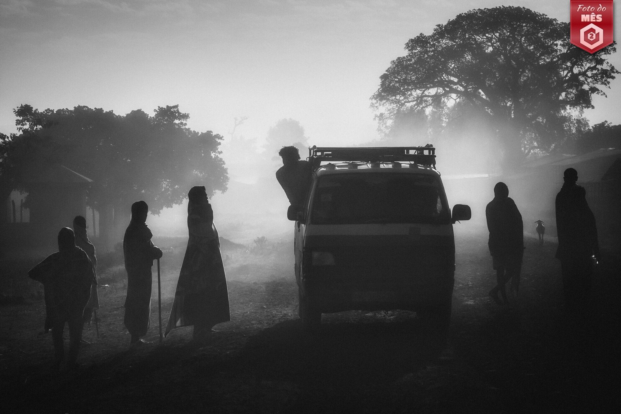 A profundidade e o jogo de luz e sombras nesta fotografia criam uma ambiência envolvente e quase etérea, onde as silhuetas ganham vida no contraste com a atmosfera difusa. A composição equilibra perfeitamente os elementos humanos e a natureza, transmitindo uma narrativa visual poderosa cheia de mistério.
